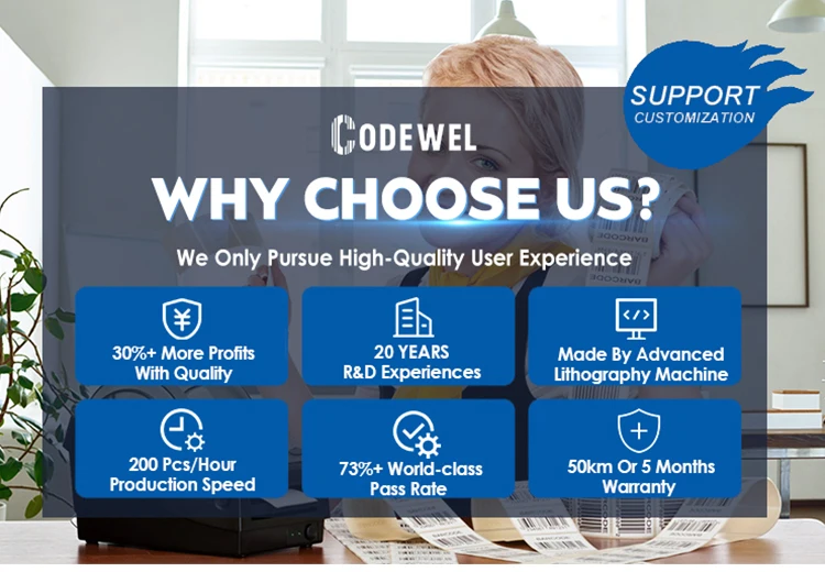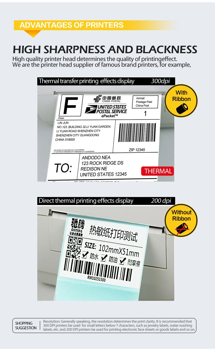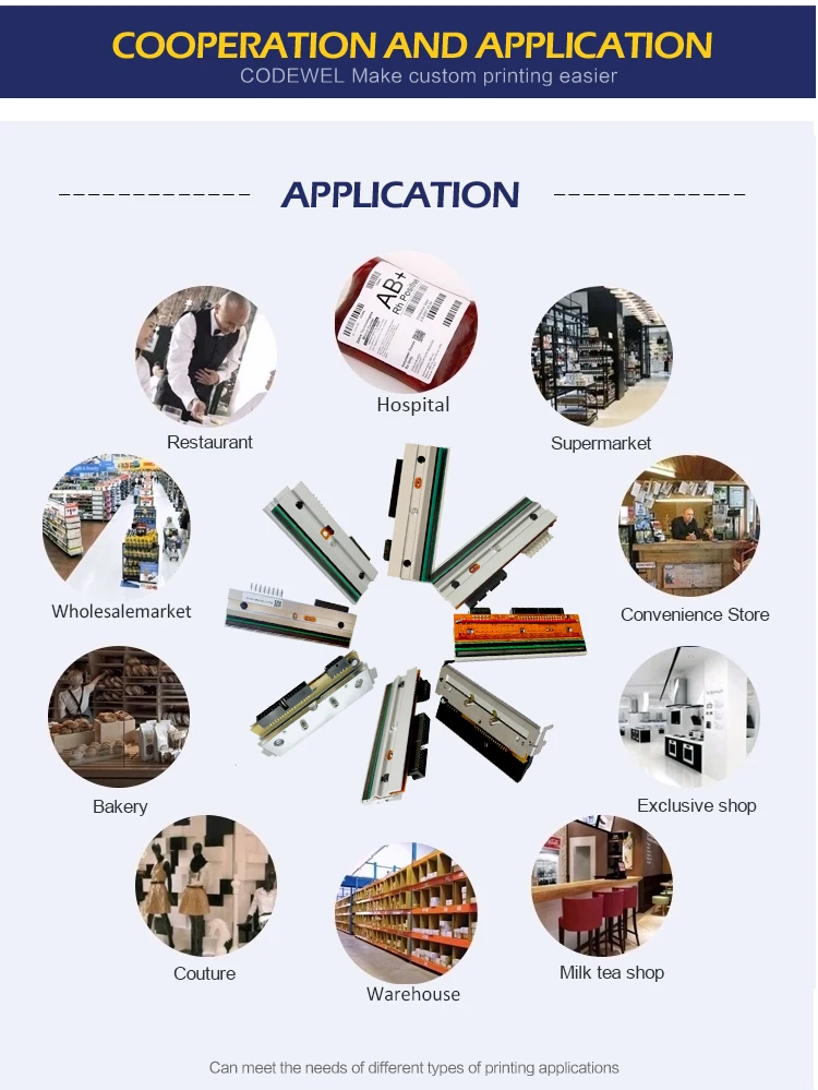 1. Q: What is the working principle of a thermal transfer print head? A: The interior of the print head is composed of tiny heating elements (dot matrix). After power is turned on, the heating elements are selectively heated according to the printing signal, so that the ribbon coating melts and transfers to the surface of the medium to form a clear image or text. 2. Q: What is the difference between thermal transfer and thermal printing? A: Thermal transfer printing: requires a ribbon, and the printed content is durable, suitable for long-term labels (such as logistics and warehousing). Thermal printing: no ribbon is required, and the thermal paper is directly heated to develop color, but the inside is easy to fade (such as cash register receipts). 3. Q:What are the advantages of Codewel compatible print heads? A: ① Ultra-high quality, all accessories are 100% brand new, made in China. ② Adopt thin film technology and independently develop internal circuit board design. ③ Provide the same warranty as the original print head. ④ With a 20-year experience R&D team in the first-class Rohm company, the quality of the print head can be controlled. 4. Q: How to correctly install the thermal transfer print head? A: ① Turn off the power of the device and remove the old print head according to the steps in the instruction manual. ② Clean the installation area to ensure that there is no dust or residue. ③ Align the new print head and fix the screws (avoid over-tightening). Calibrate the pressure after installation to ensure that the print head and the rubber roller are in uniform contact. 5. Q:What should I do if the printing density is uneven? A:① Check whether the print head pressure is balanced and adjust the rubber roller pressure. ② Clean the surface of the print head. ③ Confirm that the ribbon matches the media (such as wax-based, mixed-based or resin-based carbon ribbon). 6. Q: How often do you need to clean the print head? A: ① Regular use: Clean after each roll of ribbon is replaced or at the end of each day's work. ②High-load use: clean every 2-3 hours. ③Clean immediately when you find that the print quality has deteriorated. 7. Q: How to clean the print head correctly? A: ①Use a special cleaning pen or non-woven cloth to dip in a small amount of isopropyl alcohol (do not use water or alcohol). ②Gently wipe the surface of the print head in the same direction to avoid scratches.After cleaning, wait for it to dry completely before turning on the machine. 8. Q: How long is the life of the print head? A: Depending on the frequency of use, media type and maintenance, it is generally 30-50 km in length, and some industrial print heads can print up to 100 km in length. 9. Q: Can the print head be repaired? A: The print head is a precision electronic component and is usually not repairable. It is recommended to replace it directly. 10. Q: What is the DPI of the print head? How to choose DPI? A: DPI is resolution: measured in DPI (dots per inch), common ones are 203dpi, 300dpi, 600dpi, etc. The higher the resolution, the finer the print. 203dpi: basic logistics labels, thick barcodes (such as shipping labels). 300dpi: fine barcodes (such as medical labels), small text or simple graphics. 600dpi: high-precision images, micro text (such as electronic component labels, anti-counterfeiting labels).